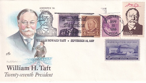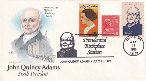 | Special hand pictorial & slogan cancellations: "Presidential Birthplace Station, QUINCY, MA 02169 JULY 11 1986 | JOHN QUINCY ADAMS - JULY 11, 1767 |". |