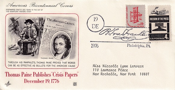 | Special hand commemorative cancellation: "ARKANSAS POST, AR 72055 JULY 4 1976 | 1776 - 1976 |". |