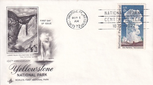 | Special machine slogan cancellation: "YELLOWSTONE PK, WY 82190 MAR 1 1972 | NATIONAL PARKS CENTENNIAL YEAR 1872 - 1972 |". |