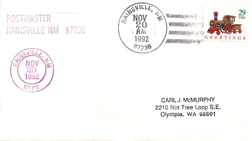 | Two different hand cancellations: "RAINSVILLE, NM 87736 NOV 20 1992" and "RAINSVILLE, NM USPS NOV 20 1992". |
