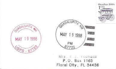 | Two different hand cancellations: "GUADALUPITA, NM 87722 MAY 19 1998" and "GUADALUPITA, NM 87722 USPS MAY 19 1998". |