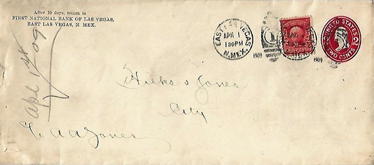 | Hand cancellation: "EAST LAS VEGAS, N.MEX. APR 1 1909 ( 1 )". [TPC] |