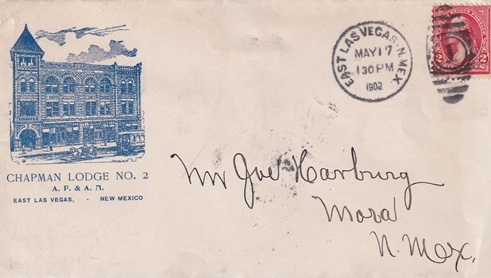 | Hand cancellation: "REC'D., EAST LAS VEGAS, N.MEX. AUG 9 1906". [TPC] |