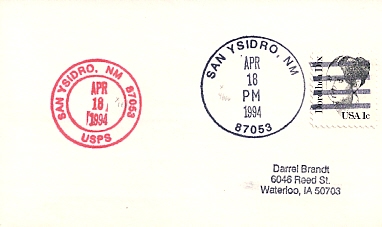 | Two different hand cancellations: "SAN YSIDRO, NM 87053 APR 18 1994" and "SAN YSIDRO, NM 87053 USPS APR 18 1994". |