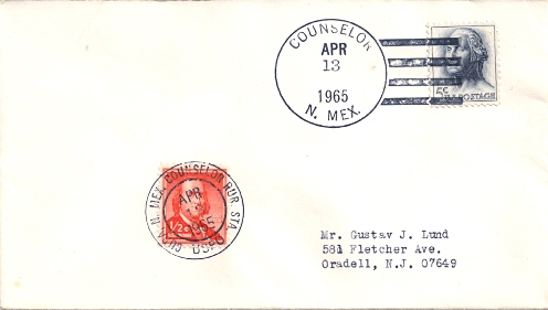 | Two different hand cancellations: "COUNSELOR, N. MEX. APR 13 1965" and "COUNSELOR RUR. STA., CUBA, N. MEX. USPO APR 13 1965". |