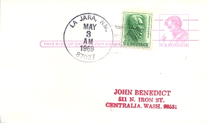 | Hand cancellation: "LA JARA, NM. 87027 MAY 3 1969". |