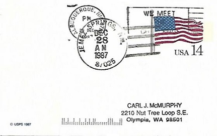 | Hand cancellation: "JEMEZ PUEBLO, NM 87024 DEC 28 1987". |