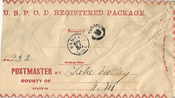 ![]() | Oval hand cancellation: "REGISTERED, SANTA FE, N. M. APR 30 1888". [TPC] |