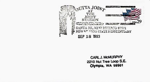 ![]() | Special hand pictorial & slogan cancellation: "OUTTA JOINT AT THE JOINT STATION, SANTA FE, NM 87501 SEP 18 1993 | NEW MEXICO STATE PENITENTIARY |". |
