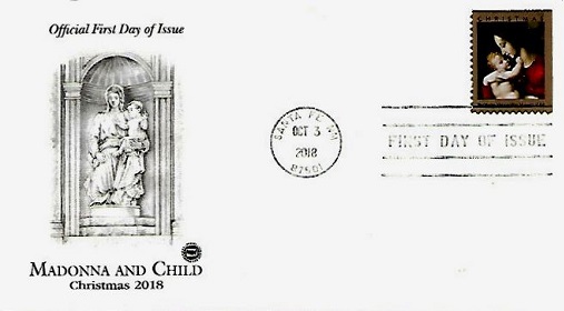 ![]() | This cacheted cover is for the first day of issue of the Christmas 2018 forever postage stamp. Special hand pictorial & slogan cancellation: "Santa Fe, NM 87501 October 3, 2018 | FIRST DAY OF ISSUE Madonna and Child BY BACHIACCA |". |