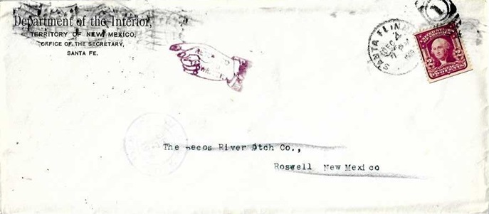 ![]() | Hand cancellation on back: "REC'D., SANTA FE, N.MEX. DEC 14 1906". [TPC] |