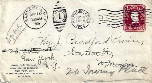 ![]() | Hand cancellations: "SANTA FE, N.MEX. DEC 4 1906 ( 1 )", "SANTA FE, N.MEX. DEC 13 1906 ( 1 )", and "SANTA FE, N.MEX. DEC 15 1906 ( 1 )". Has "RETURNED TO WRITER" pointing hand and "No such firm at Alamogordo, N. Mex." auxiliary markings. [TPC] |