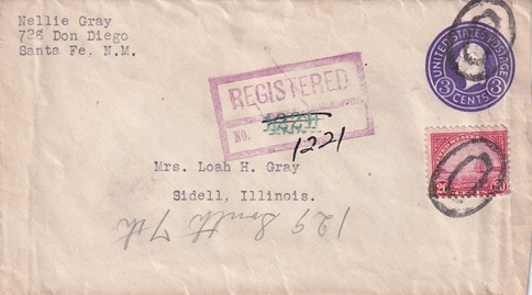 | Hand cancellation on back: "REGISTERED, SANTA FE, N. MEX. OCT 4 1911". Has "REGISTERED NO." auxiliary marking on front. [TPC] |