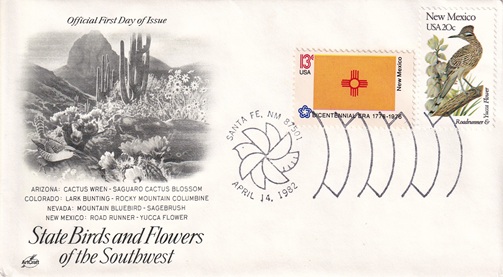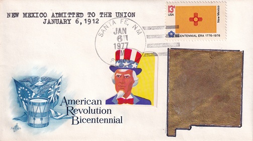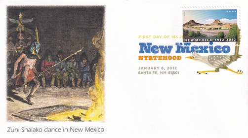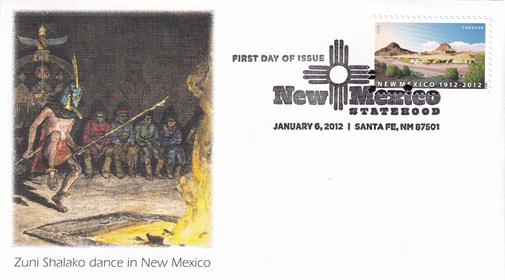 ![]() | This cacheted cover is for the first day of issue of the New Mexico Statehood centennial forever postage stamp. Special machine slogan cancellation: "SANTA FE, NM 87501 JAN 6 2012 | FIRST DAY OF ISSUE |". |
