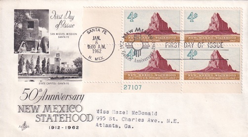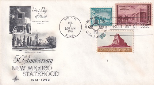 | These cacheted covers are for the first day of issue of the 4 cents New Mexico Statehood postage stamp. Special machine pictorial & slogan cancellations: "SANTA FE, N.MEX. JAN 6 1962 | FIRST DAY OF ISSUE | ( New Mexico Golden Anniversary 1912 1962 )". |