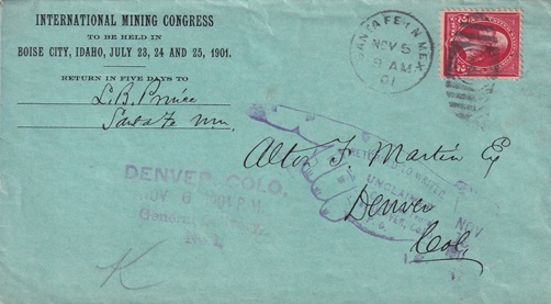![]() | Hand cancellation on back: "REC'D., SANTA FE, N.MEX. NOV 14 '01". Has "DENVER, COLO. NOV 6 1901 P.M. General Delivery, No. 1." and "RETURNED TO WRITER. UNCLAIMED ... NOV 13 1901" pointing hand auxiliary markings on front. [TPC] |