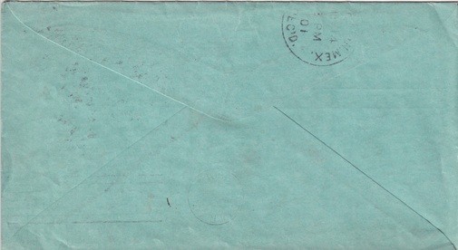 ![]() | Hand cancellations: "SANTA FE, N.MEX. DEC 4 1906 ( 1 )", and SANTA FE, N.MEX. DEC 11 1906 ( 1 ). Has "RETURNED TO WRITER" pointing hand auxiliary marking. [TPC] |