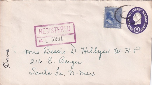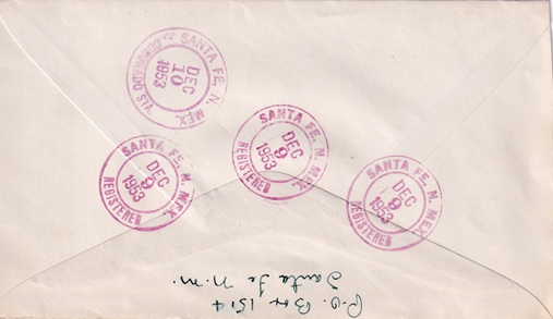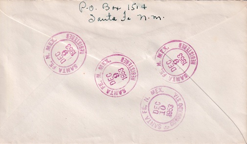 | Hand cancellation on back: "REGISTERED, SANTA FE, N. MEX. DEC 9 1953". Has "REGISTERED NO." auxiliary marking on front. |