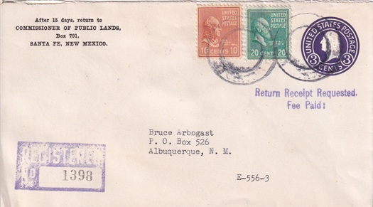 | Hand cancellation on back: "REGISTERED, SANTA FE, N. MEX. APR 23 1948". Has "REGISTERED NO." and "RETURN RECEIPT REQUESTED" auxiliary markings on front. |