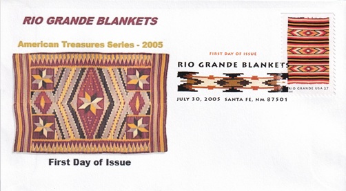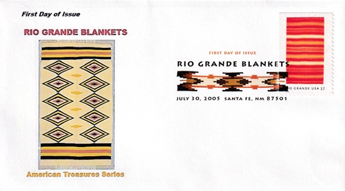 | These cacheted covers are for the first day of issue of the 37 cents Rio Grande Blankets postage stamps. Special digital color pictorial & slogan cancellations: "SANTA FE, NM 87501 JULY 30, 2005 | FIRST DAY OF ISSUE RIO GRANDE BLANKETS |". |