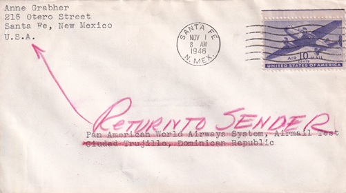 ![]() | Hand cancellation: "SANTA FE, N.MEX. AUG 5 1907 ( 1 )". Has "RETURNED TO WRITER" pointing hand auxiliary marking. [TPC] |