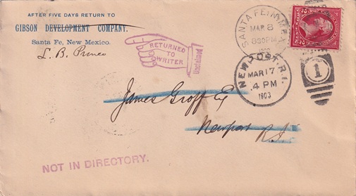 ![]() | Hand cancellation: "SANTA FE, N.MEX. MAR 8 1903 ( 1 )". Has "NOT IN DIRECTORY" and "Unclaimed RETURNED TO WRITER" pointing hand auxiliary markings. [TPC] |