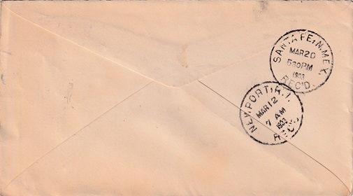 ![]() | Hand cancellation on back: "REC'D., SANTA FE, N.MEX. MAR 10 1906". [TPC] |