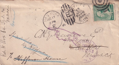 ![]() | Hand cancellation on back: "REC'D., SANTA FE, N.MEX. AUG 19 1889". Has "N.Y. I.D." pointing hand auxiliary marking on front. [TPC] |