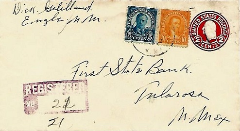| Hand cancellation on front and back: "ENGLE, N. MEX. NOV 1 1938". Has "REGISTERED NO." auxiliary marking on front. |