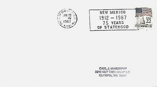 | Machine commemorative slogan cancellation: "TRUTH OR CONSEQUENCES, NM 87901 JAN 20 1987 | NEW MEXICO 1912 - 1987 75 YEARS OF STATEHOOD |". |