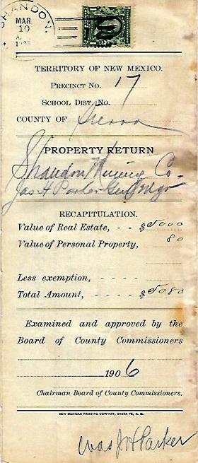 | Doane hand cancellation on document: "SHANDON, N. MEX. MAR 10 1906 | 1 |". [TPC] |