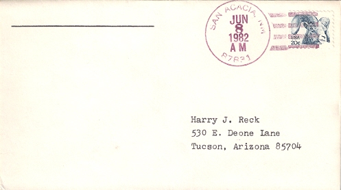 | Hand cancellation: "SAN ACACIA, NM 87831 JUN 8 1982". |