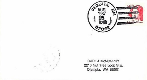 | Hand cancellation: "VEGUITA, NM 87062 AUG 15 1987". |