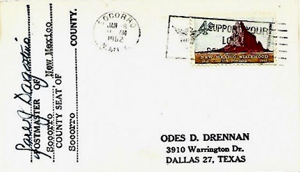 | Machine pictorial & slogan cancellation: "SOCORRO, N.MEX. JAN 18 1962 | SUPPORT YOUR LOCAL SCIENCE FAIR |". |
