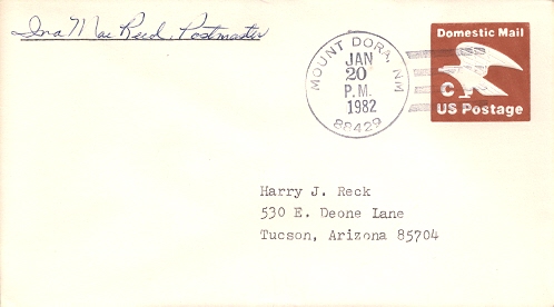 | Hand cancellation: "MOUNT DORA, NM 88429 JAN 20 1982". |