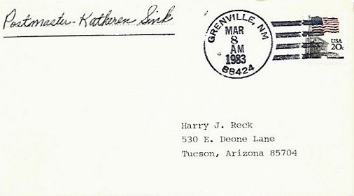 | Hand cancellation: "GRENVILLE, NM 88424 MAR 8 1983". |