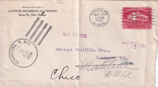 Hand cancellation: "GLADSTONE, N. MEX. JUN 2 1932".