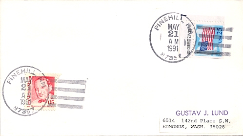 ![]() | Hand cancellation: "PINEHILL, NM 87357 MAY 21 1991". |