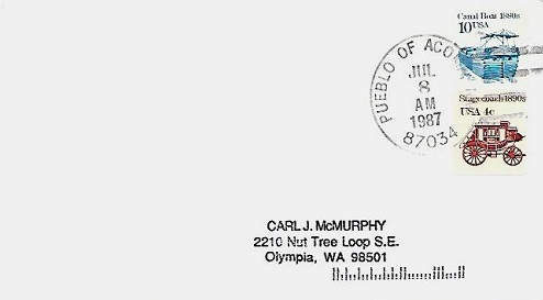 | Two different hand cancellations: on front and back "PUEBLO OF ACOMA, NM 87034 JUL 8 1987" and on back "CONTRACT STA., PUEBLO OF ACOMA, NM USPO JUL 8 1987". |