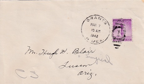 | Hand cancellation: "GRANTS, N.MEX. MAR 7 1942 ( 1 )". |