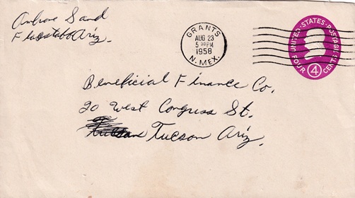 | Machine cancellation: "GRANTS, N.MEX. AUG 23 1958". |