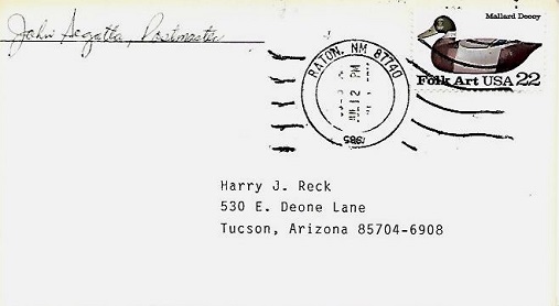 | Hand cancellation: "RATON, NM USPS FEB 18 1988". |