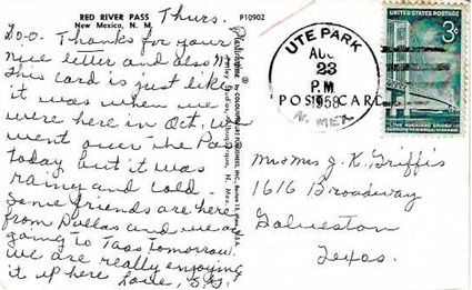 | Hand cancellation: "UTE PARK, N. MEX. AUG 23 1958". |