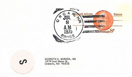 | Hand cancellation: "WH. S'NDS. MIS'L. RNG. BR., LAS CRUCES N.MEX. MY 19" [1965]. |