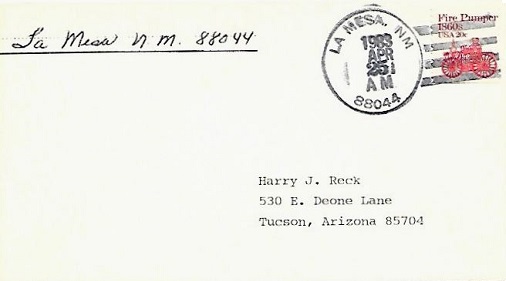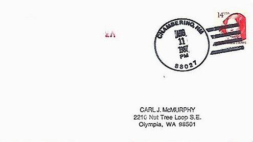 | Hand cancellation: "CHAMBERINO, NM 88027 AUG 11 1987". |
