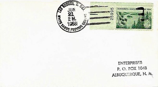 | Hand cancellation: "WHITE SANDS PROVING GROUND, LAS CRUCES, N. MEX. JUN 21 1958". |