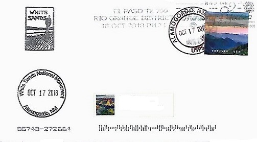 Hand postal cancellation: "ALAMOGORDO, NM 88310 USPS OCT 17 2018". Passport cancellation: "White Sands National Monument. Alamogordo, NM. OCT 17 2018".