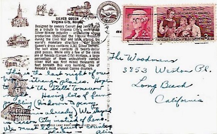 | Special hand slogan cancellation: "Rinckel Mansion Station, Carson City P.O. | SITE OF FIRST POSTOFFICE NOVENBER 18, 1858 |" [JULY 22 1964]. |