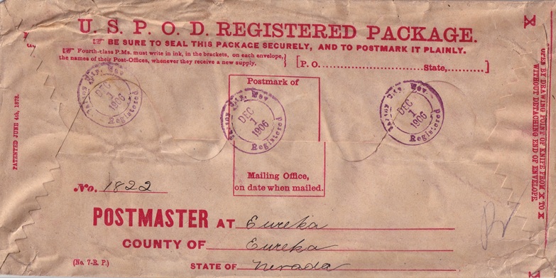 | Hand cancellation on "U. S. P. O. D. Registered Package": "Registered, Carson City, Nev. DEC 1 1906". |