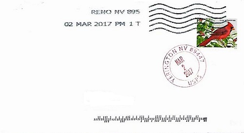 ![]() | Hand cancellation: "YERINGTON, NV 89447 USPS MAR 2 2017". |